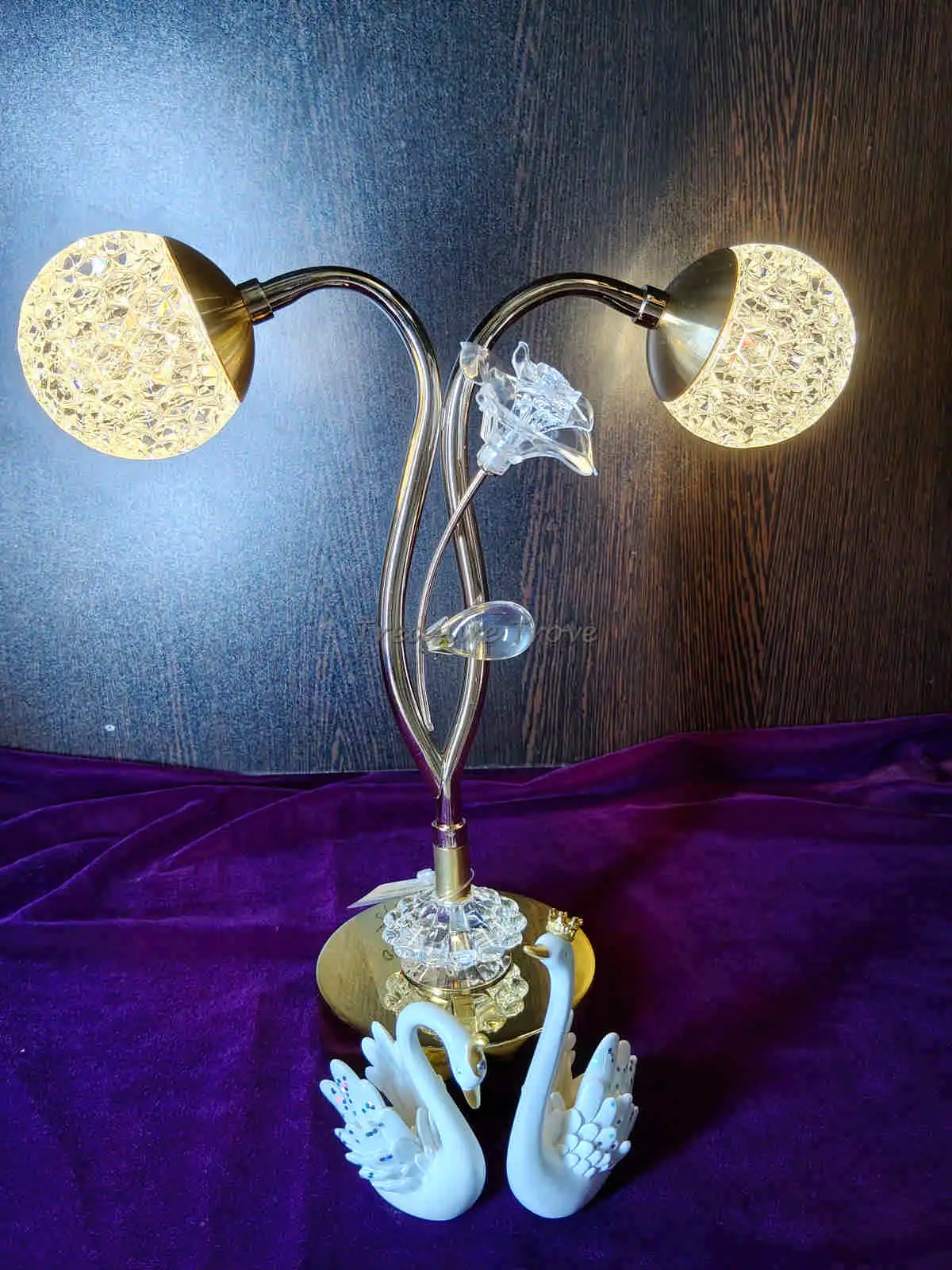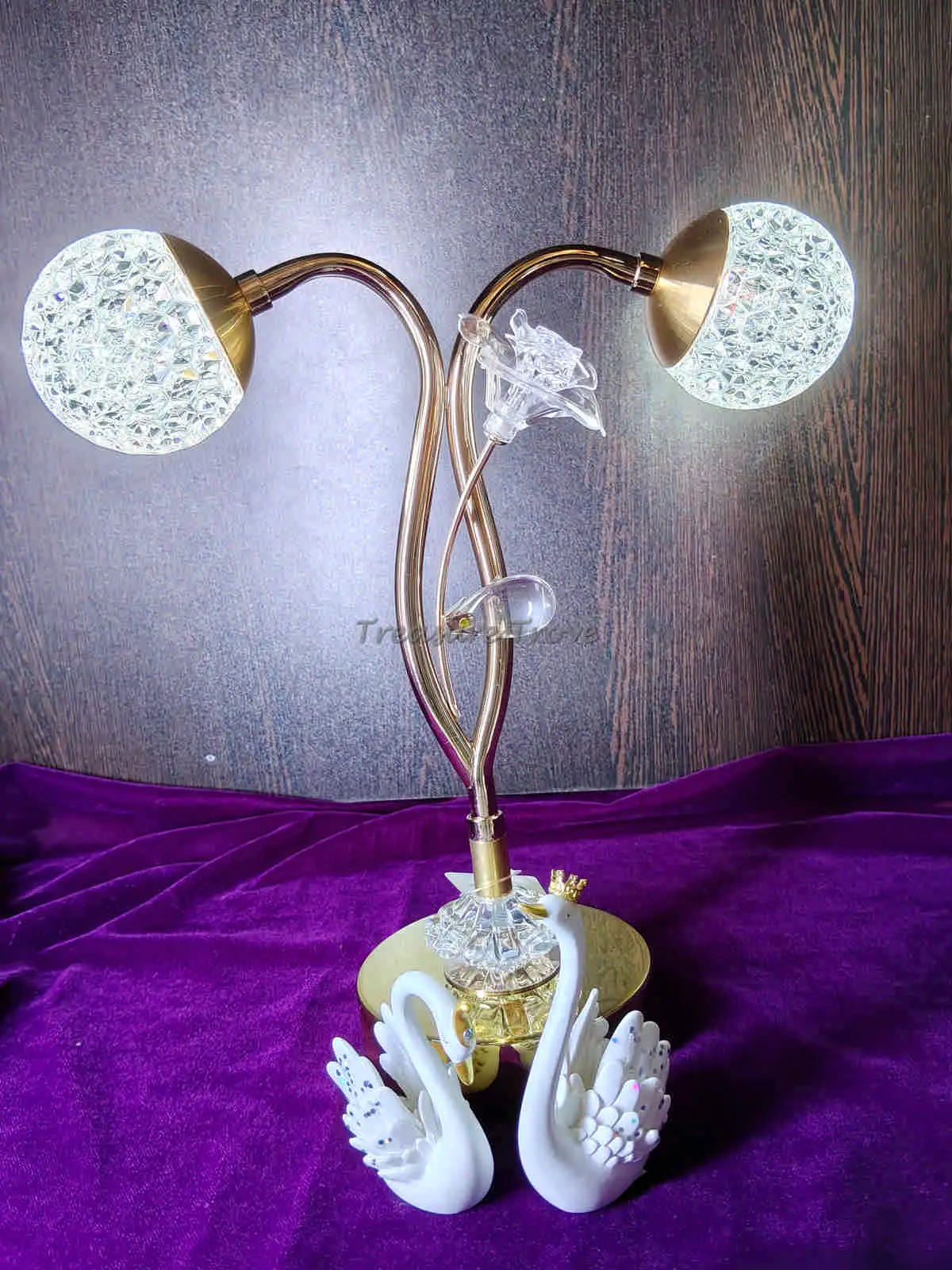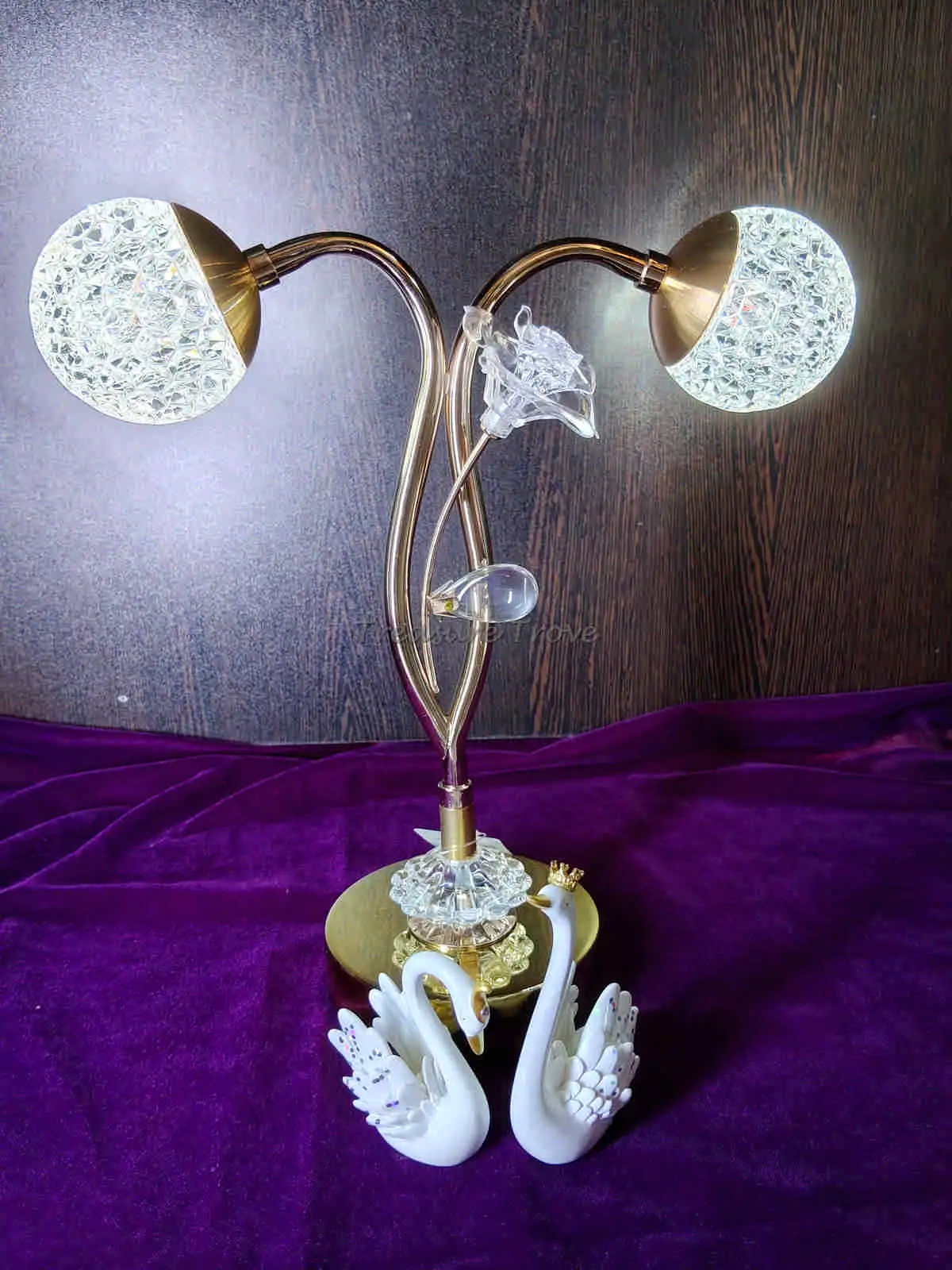 Upgrade your décor lighting with this Dual Head Crystal Rechargeable LED Table Lamp, designed to combine elegance with functionality. The lamp features two crystal-pattern LED heads mounted on a sleek gold-finish metal frame, creating a refined and modern aesthetic.